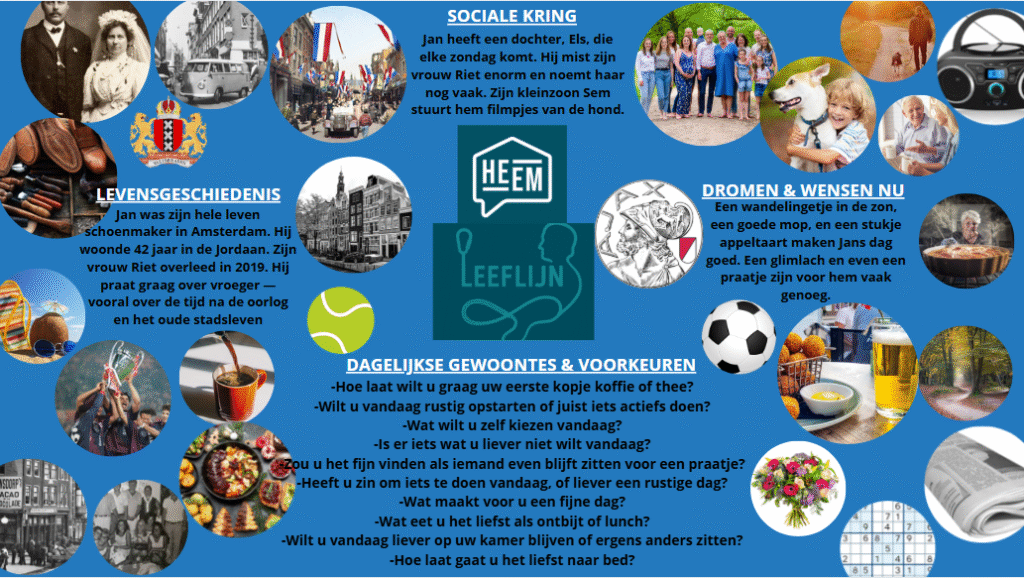 Nieuwe bewoners die bij ’t Heem komen wonen, ervaren vaak dat hun identiteit en eigenheid naar de achtergrond verdwijnt in de zorgomgeving. Het was belangrijk om een manier te vinden waarop hun levensverhaal zichtbaar en bespreekbaar blijft. Dit versterkt niet alleen hun gevoel van eigenwaarde, maar maakt ook dat zorgmedewerkers en familie op een betekenisvolle manier in contact kunnen blijven. Voor mij persoonlijk was dit project belangrijk omdat het laat zien hoe zorgtechnologie en creatieve interventies bijdragen aan mensgerichte zorg.